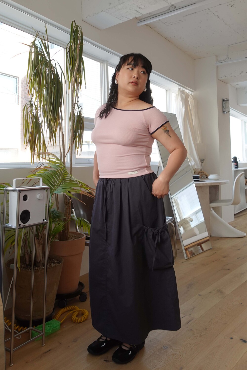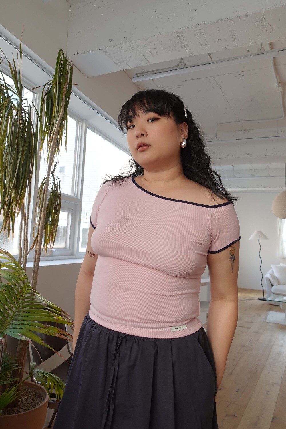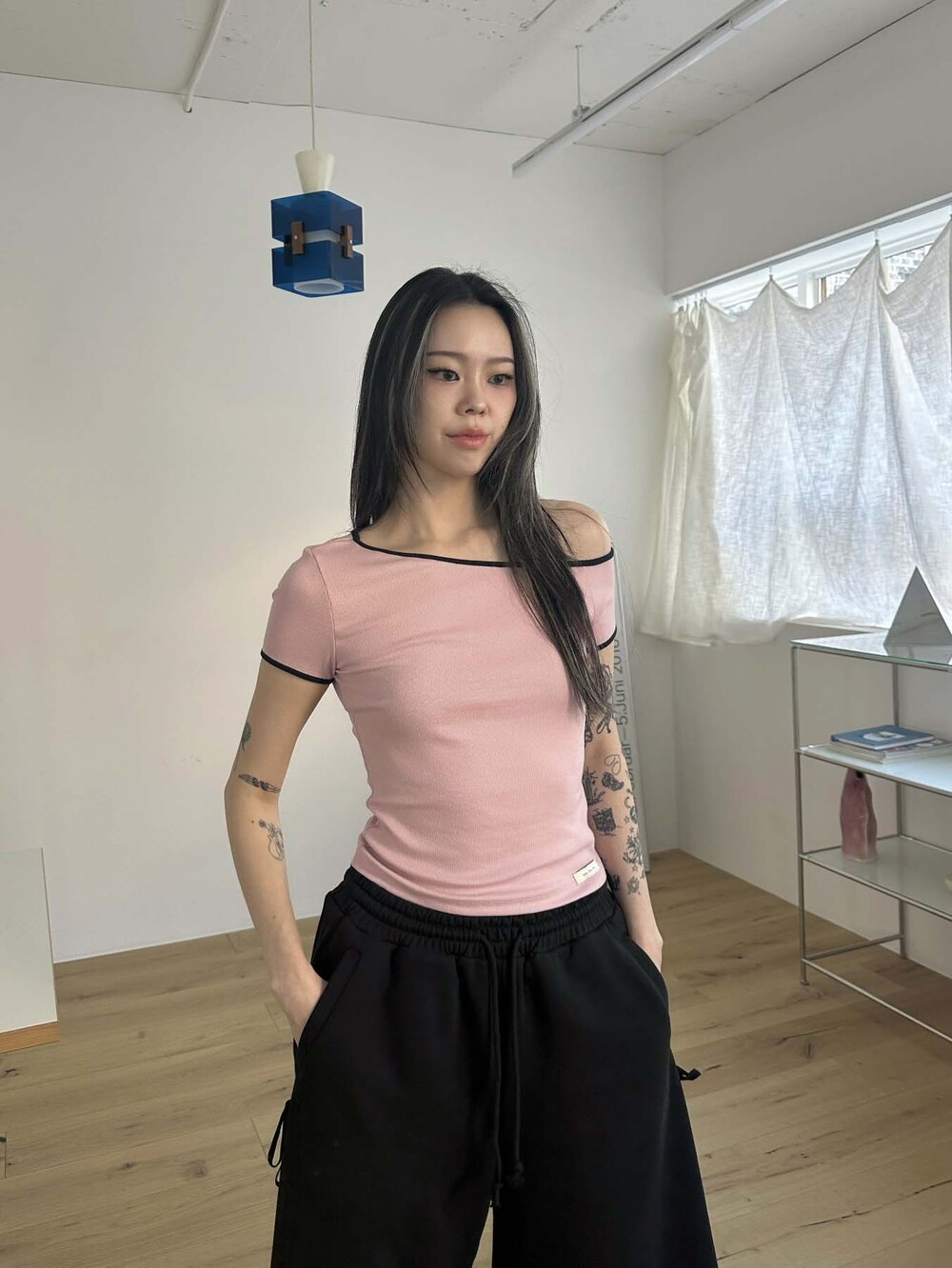* 숄더 라인과 소매 밑단에 배색 바인딩 디테일