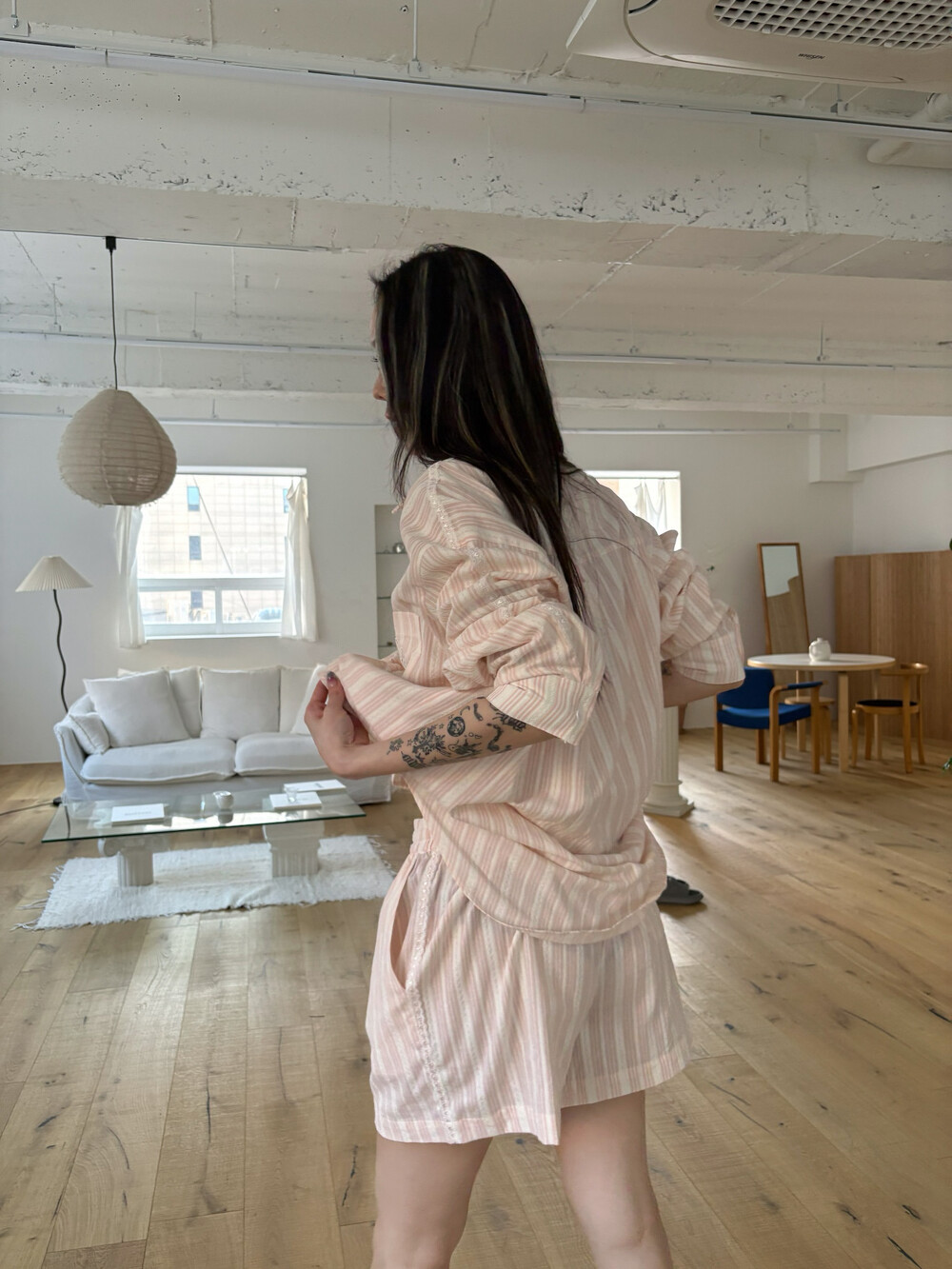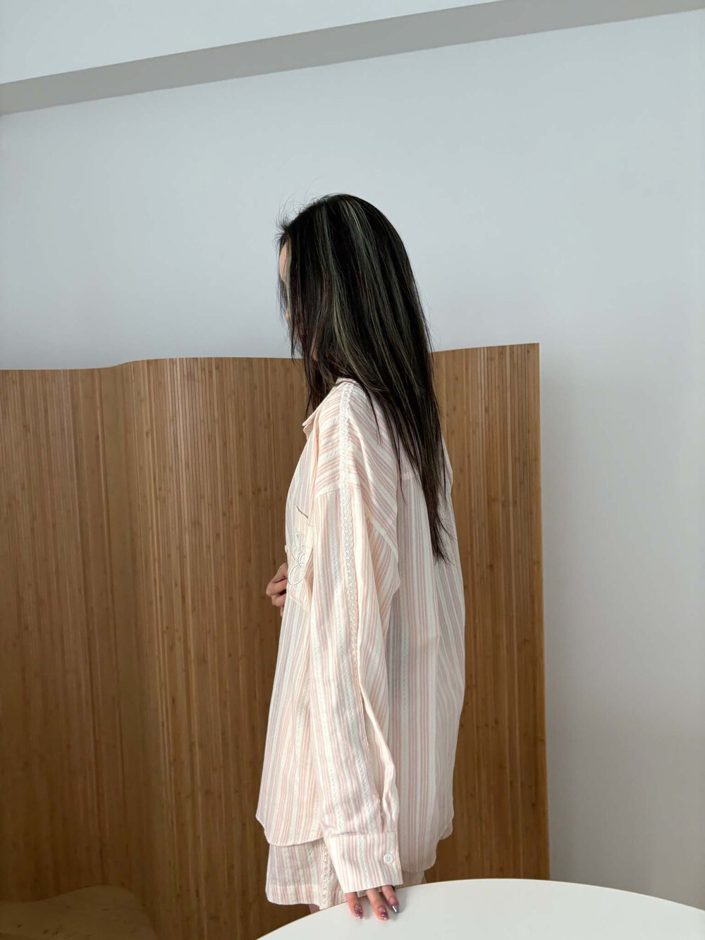 * 스트라이프 패턴과 직조 레이스 디테일이 조화된 원단 (100% 코튼)