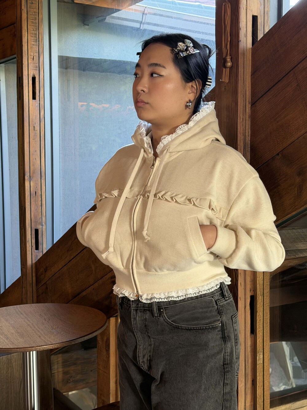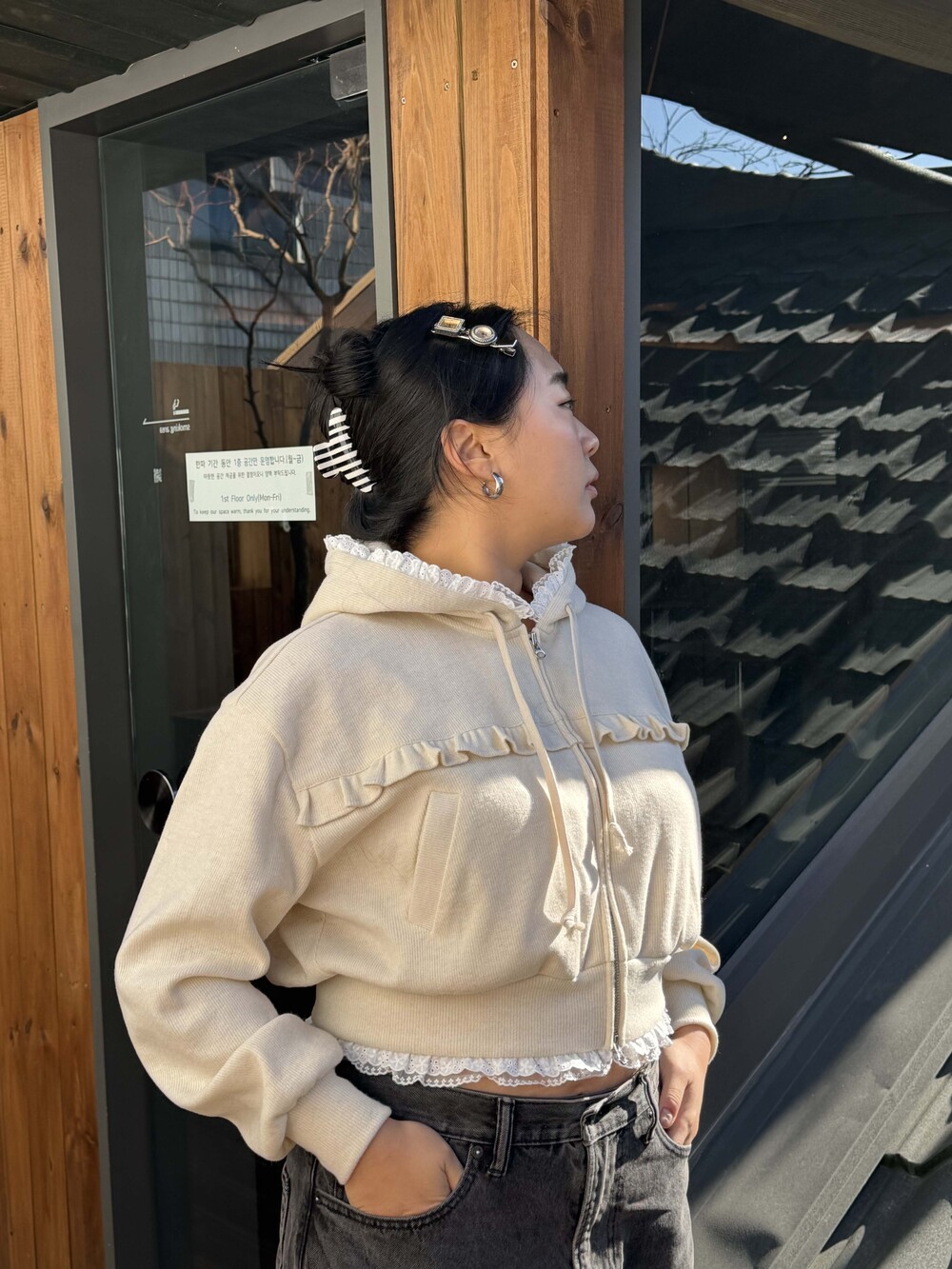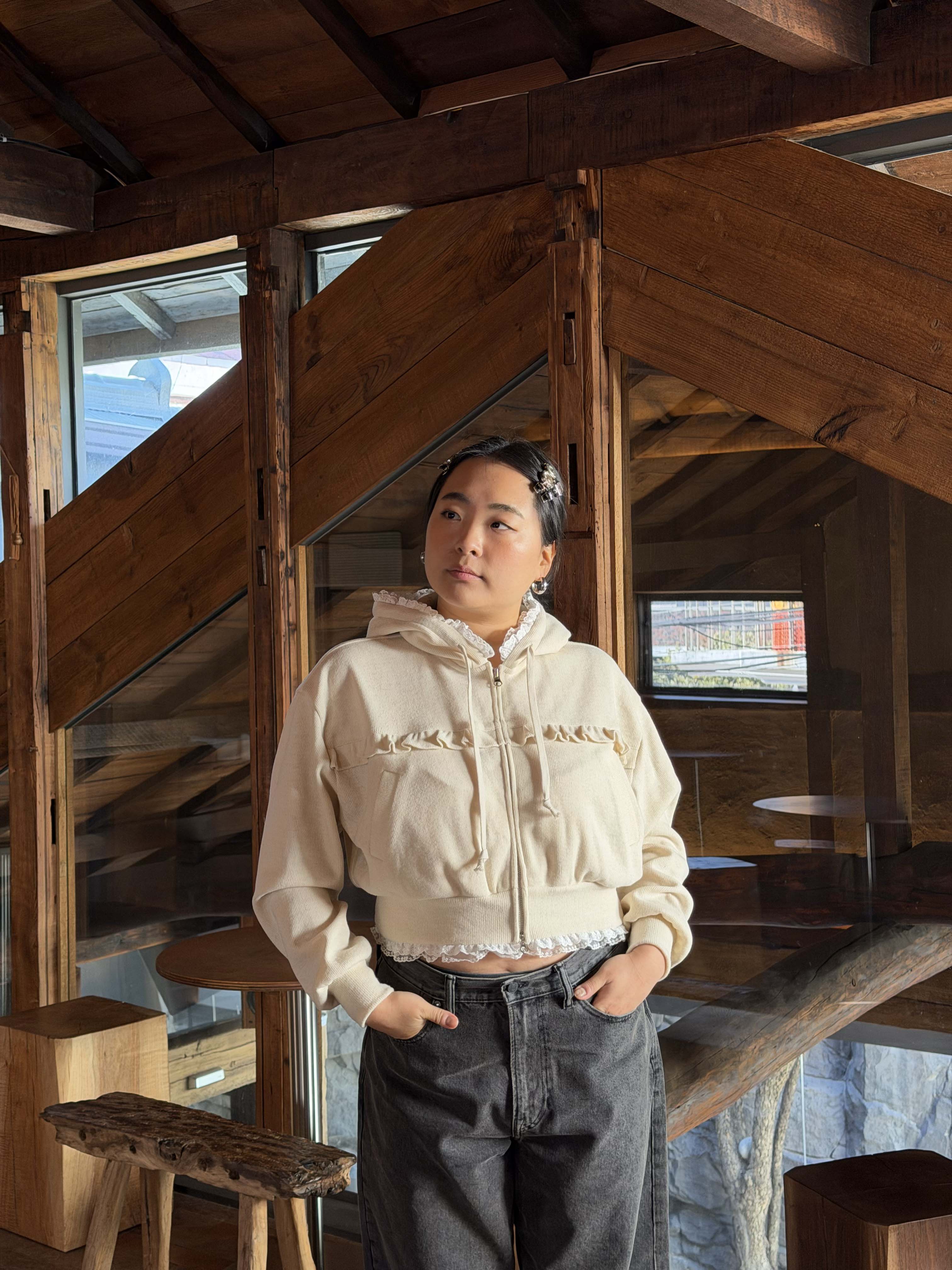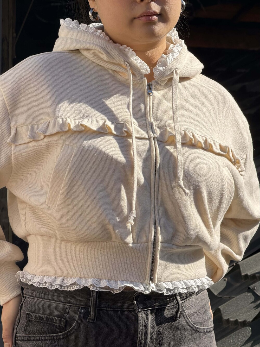 * 밑단, 후디 모자에 레이스 러플 디테일