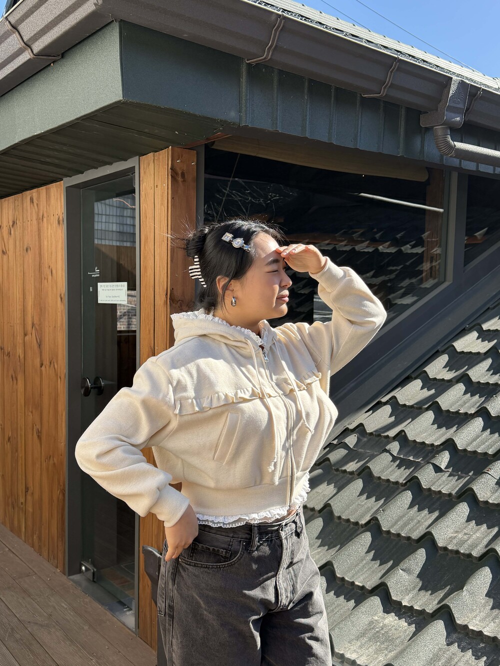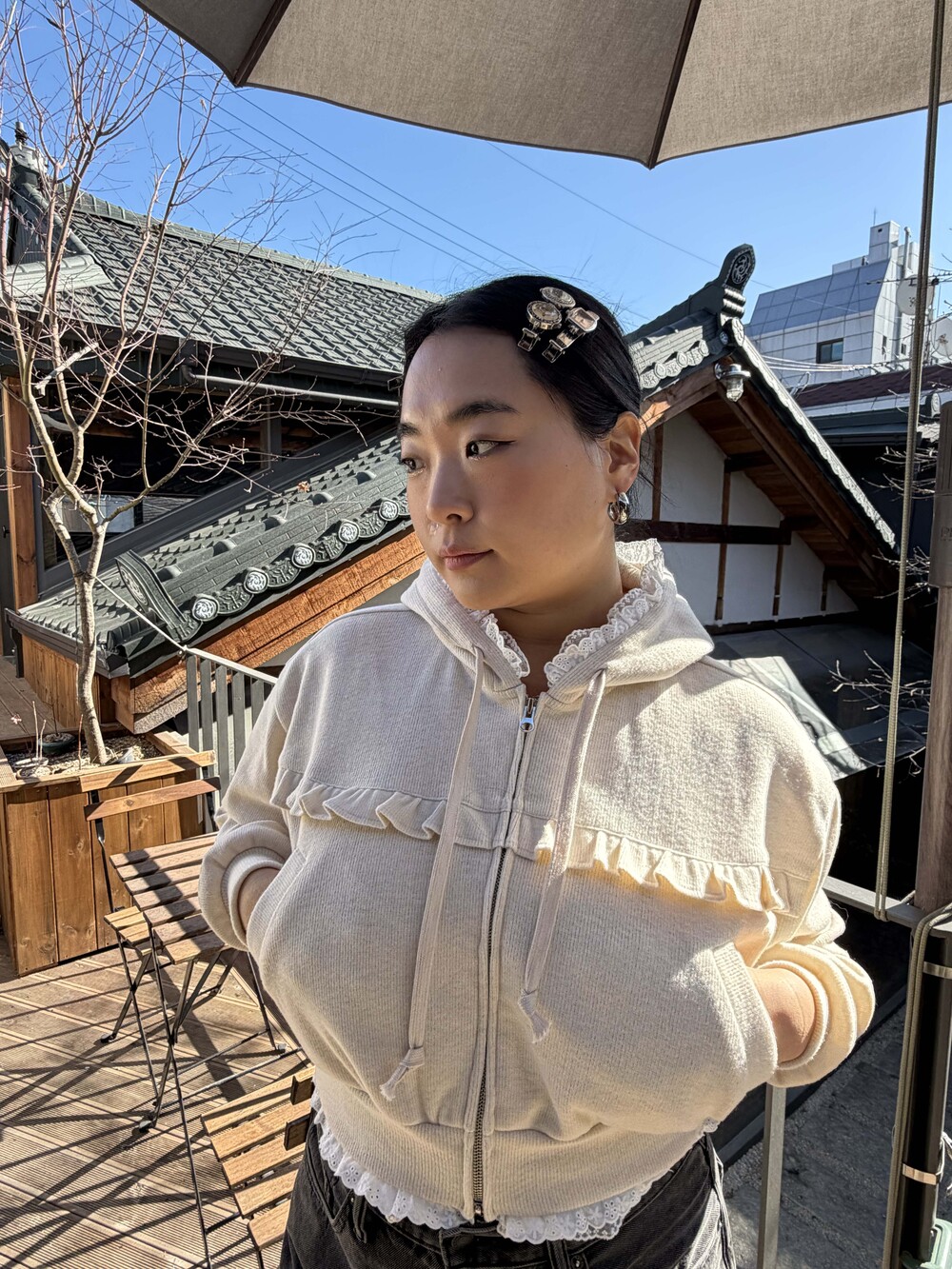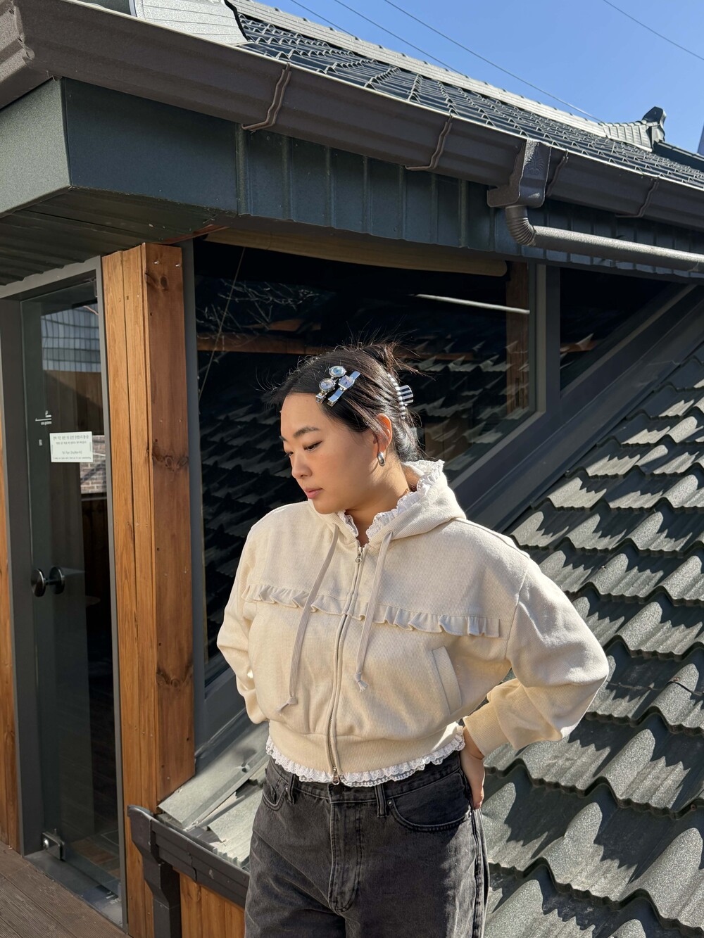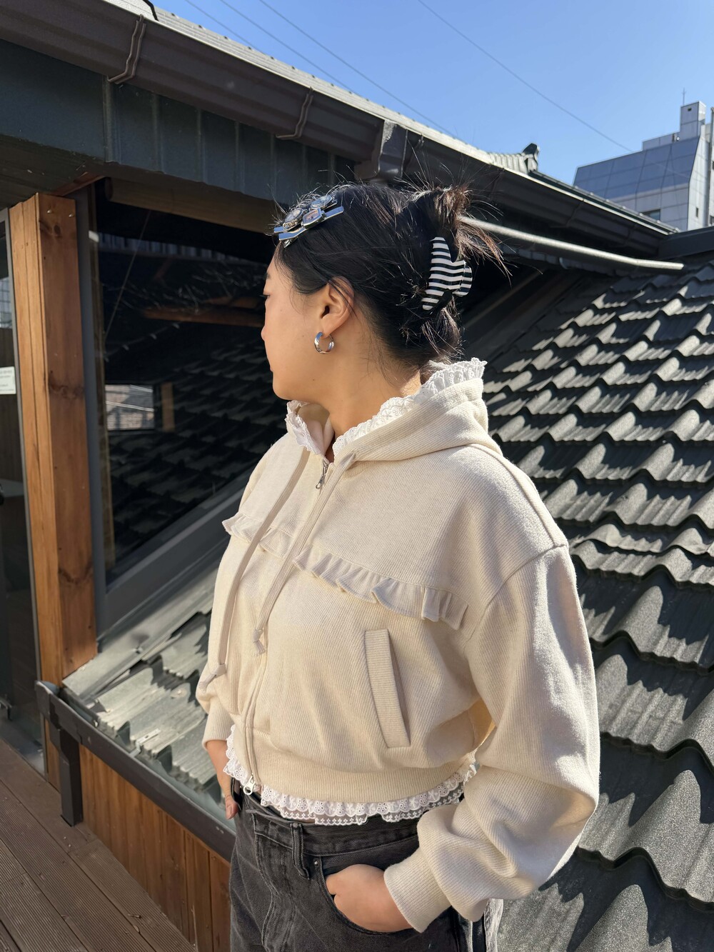 * 밑단, 후디 모자에 레이스 러플 디테일
